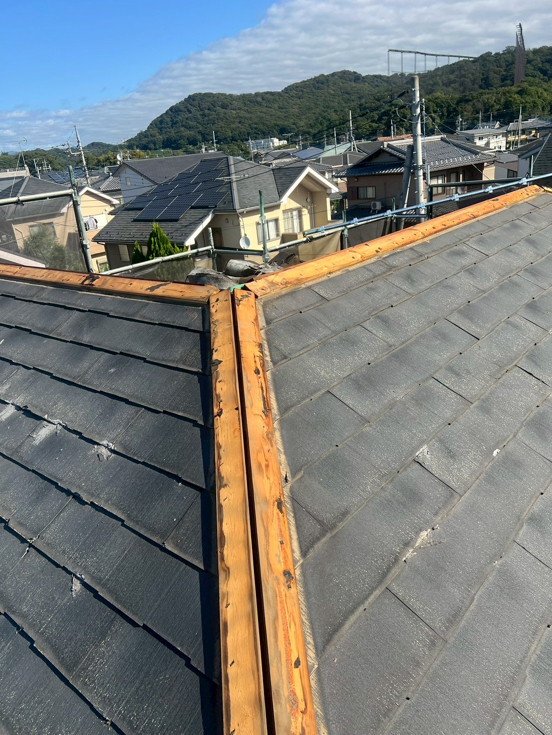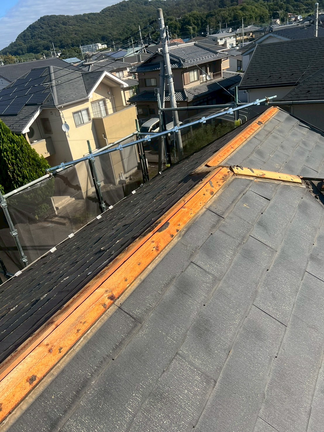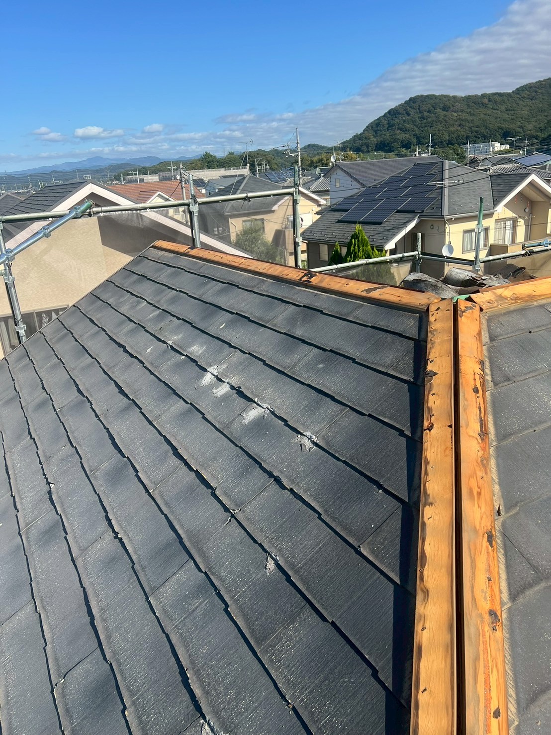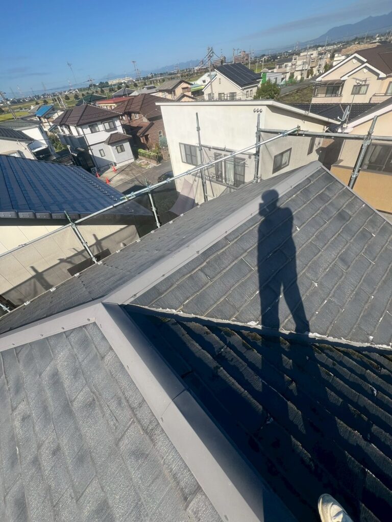 屋根からポロポロと劣化したスレート屋根の破片が飛んできているということでご依頼いただきました。