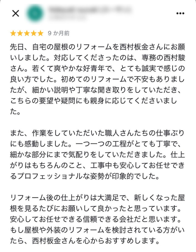 リフォーム後の仕上がりは大満足で、新しくなった屋根を見るたびにお願いして良かったと思っています。安心してお任せできる信頼できる会社だと思います。もし屋根や外装のリフォームを検討されている方がいたら、西村板金さんを心からおすすめします。
