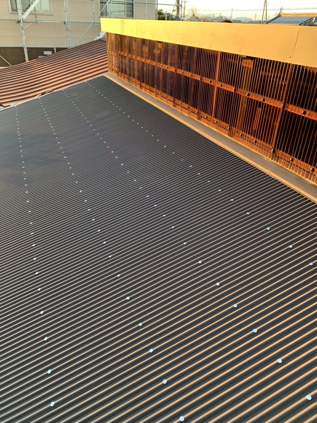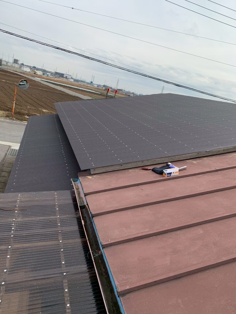 Works Detail太田市 Y様 金属波板から金属波板カバー工法と外壁ポリカ波板 カテゴリー屋根外壁 エリア太田市 金額87万円 工事期間 約2週間 工事内容 農機具小屋の屋根が赤く錆び始めてたためご相談をいただきました。現状の瓦棒屋根から板金屋根にカバー工法で施工しました。 施工の様子